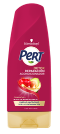 Acondicionador Pert con granada y aceite de aguacate 360 ml. Su fórmula ayuda a desintoxicar y reparar el cabello dañado por la contaminación.
